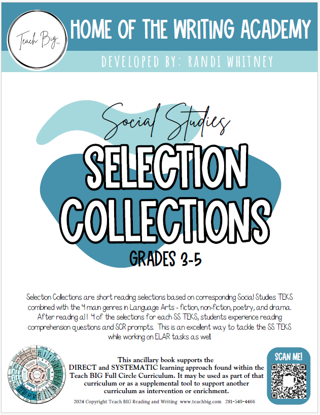 Selection Collections use Social Studies TEKS and four Language Arts genres—fiction, nonfiction, poetry, and drama—to expose students to diverse texts. They include vocabulary banks, text connection questions, and short constructed response prompts to build comprehension and support both Social Studies and ELAR skills.
