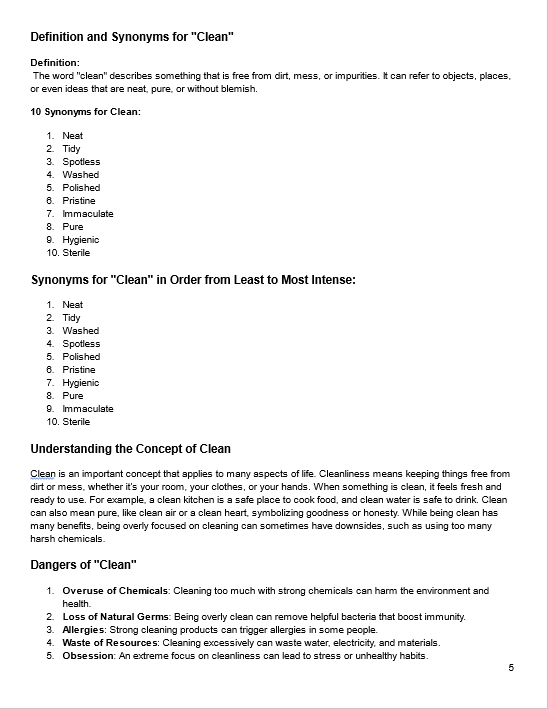 The Very Good Book "Clean" is a 36-page resource designed for grades 3-8 that focuses on teaching synonyms and antonyms through monthly word studies tailored to grade level and needs. Each word study includes definitions, synonyms, idioms, examples, and engaging projects to help students expand their vocabulary deeply and meaningfully over time.