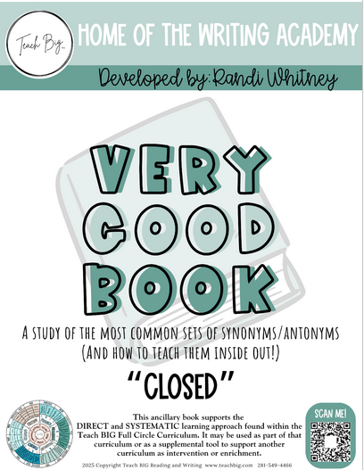 The Very Good Book "Closed" is a 36-page resource designed for grades 3-8 that focuses on teaching synonyms and antonyms through monthly word studies tailored to grade level and needs. Each word study includes definitions, synonyms, idioms, examples, and engaging projects to help students expand their vocabulary deeply and meaningfully over time.