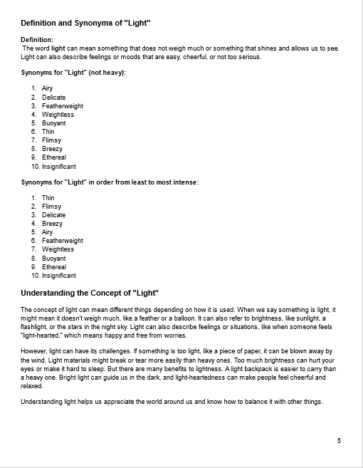 The Very Good Book "Light" is a 36-page resource designed for grades 3-8 that focuses on teaching synonyms and antonyms through monthly word studies tailored to grade level and needs. Each word study includes definitions, synonyms, idioms, examples, and engaging projects to help students expand their vocabulary deeply and meaningfully over time.