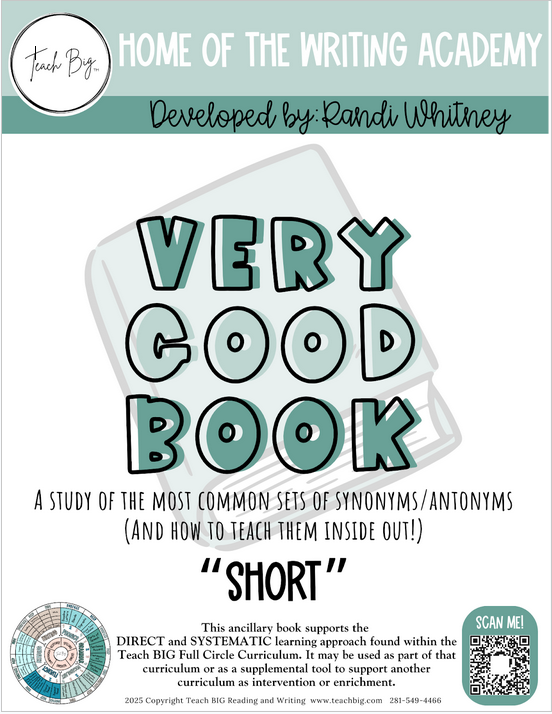 The Very Good Book "Short" is a 36-page resource designed for grades 3-8 that focuses on teaching synonyms and antonyms through monthly word studies tailored to grade level and needs. Each word study includes definitions, synonyms, idioms, examples, and engaging projects to help students expand their vocabulary deeply and meaningfully over time.