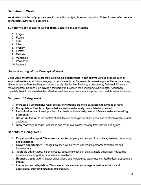 The Very Good Book "Weak" is a 36-page resource designed for grades 3-8 that focuses on teaching synonyms and antonyms through monthly word studies tailored to grade level and needs. Each word study includes definitions, synonyms, idioms, examples, and engaging projects to help students expand their vocabulary deeply and meaningfully over time.