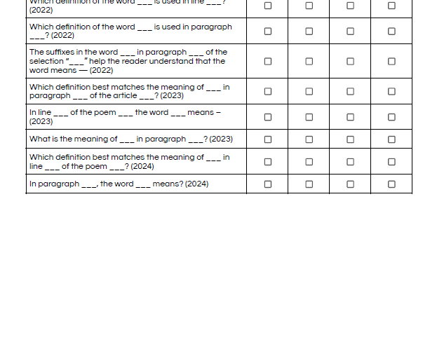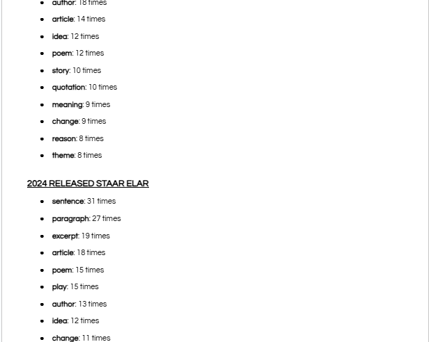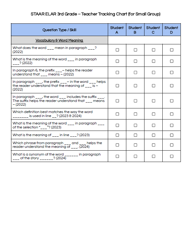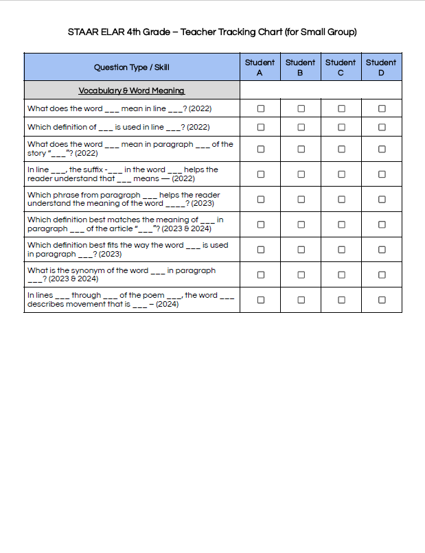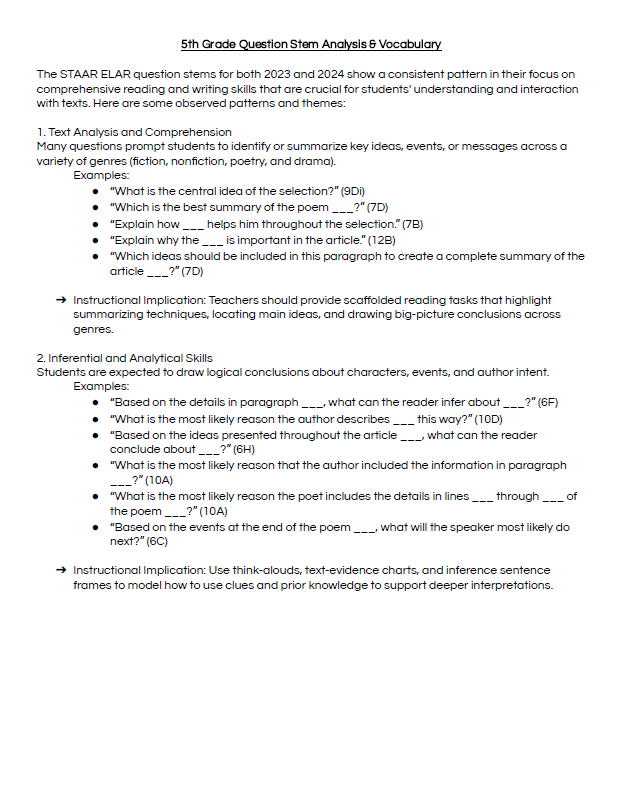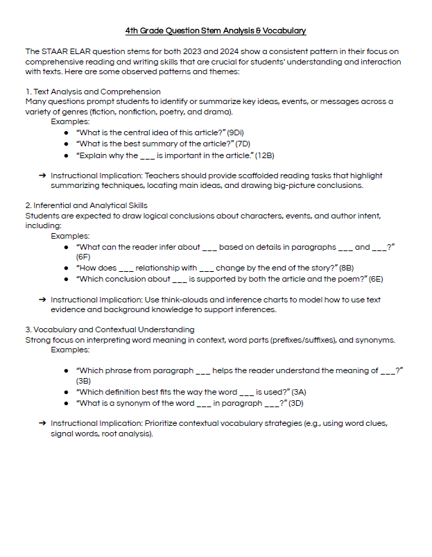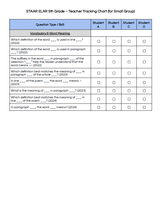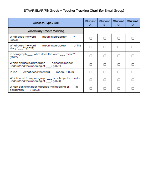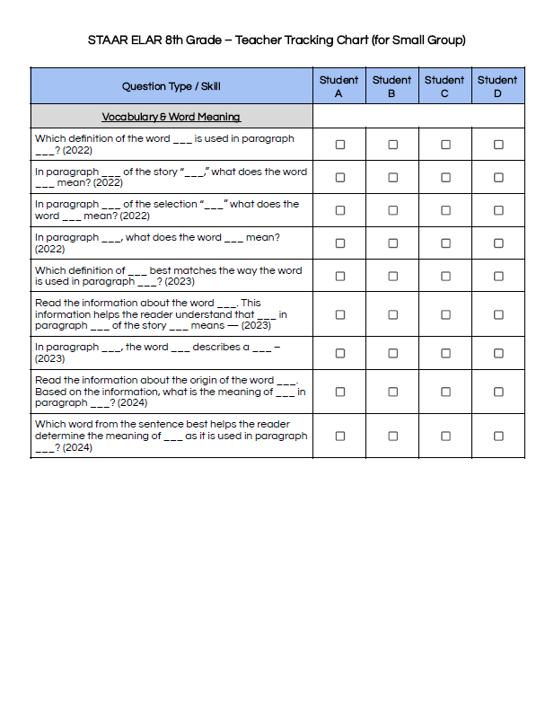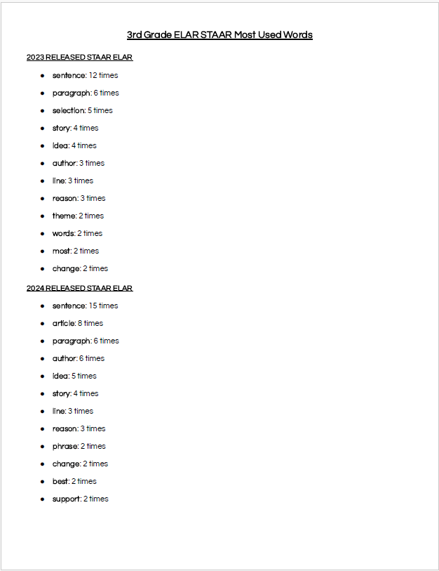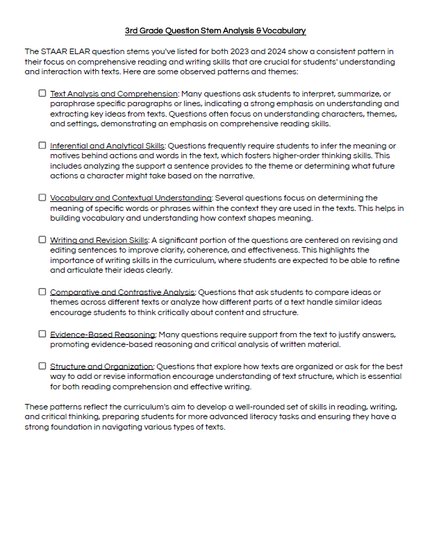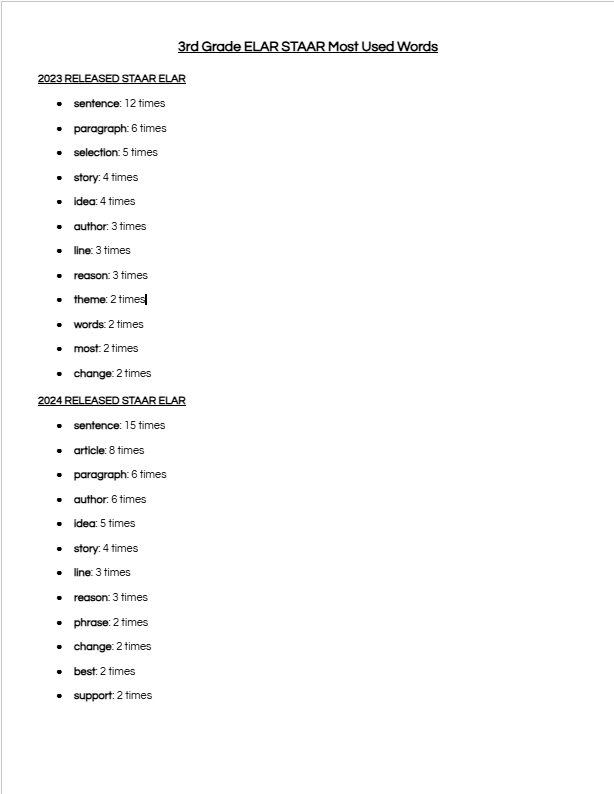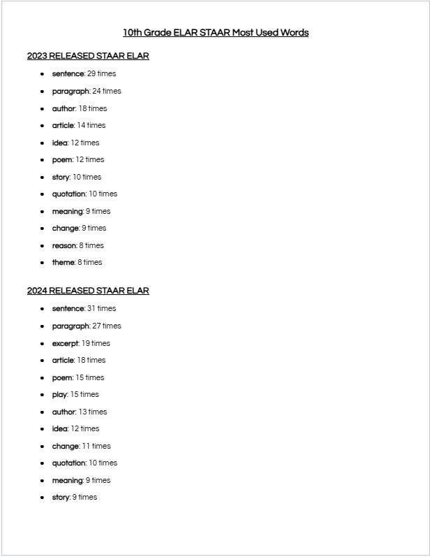 Whether you're targeting reading, revising, or editing, you'll discover materials that break down what STAAR really expects—no fluff, just focused, TEKS-aligned content. Explore frequency-based vocabulary lists, released-item question banks, response scaffolds, and tracking tools that make progress visible and success attainable. These are the resources Texas teachers trust to close gaps, sharpen instruction, and make intervention and enrichment data-driven!!!!