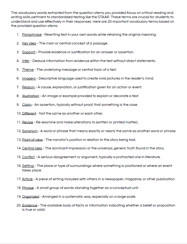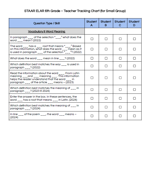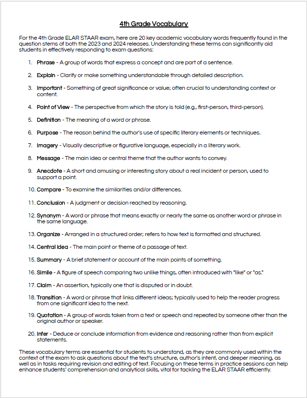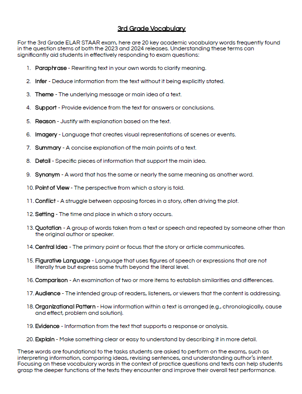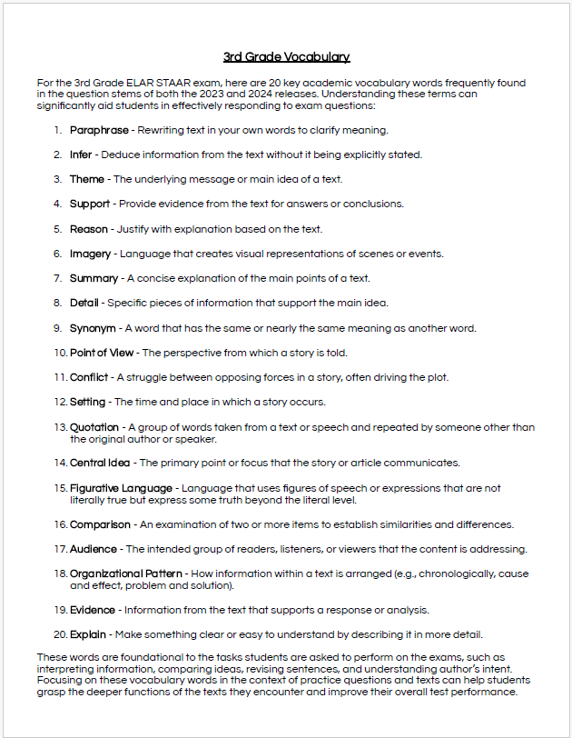 Welcome to your ultimate STAAR support zone—where precision meets preparation and everything is built from the source. This category is packed with powerful tools designed to help teachers and students conquer the STAAR with confidence. Inside, you’ll find academic vocabulary pulled straight from released STAAR tests and question stems taken directly from those same assessments—ensuring every resource reflects the exact language, format, and rigor students will encounter.