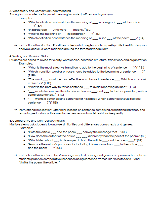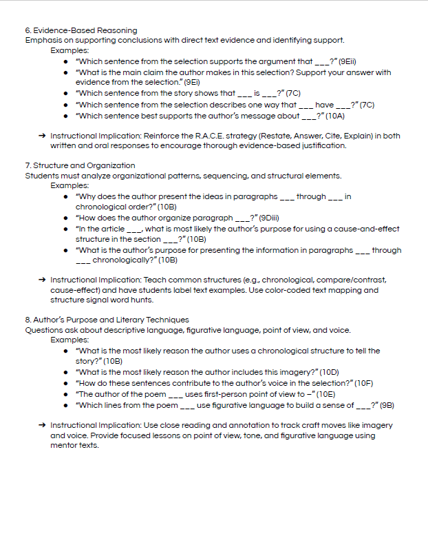 This document is a detailed instructional guide that breaks down 5th grade STAAR ELAR question stems and vocabulary from the 2023–2024 assessments. It categorizes questions by TEKS standards and cognitive levels, providing educators with targeted teaching strategies to develop students’ comprehension, writing, and critical thinking skills aligned with tested academic expectations.