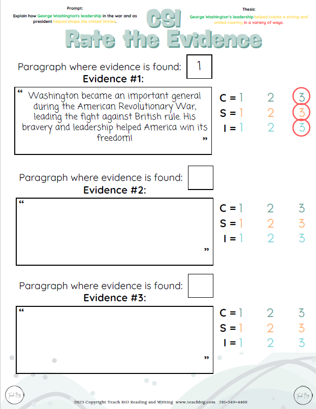 The CSI Textual Evidence Evaluation Packet from Teach BIG helps students master citing strong, relevant evidence using a clear 1–3 rating scale focused on Connection, Support, and Inference. Ideal for educators seeking to improve writing instruction and assessment, this resource aligns with the Full Circle of Language Arts framework and complements Teach BIG’s professional development seminars for building confident, skilled writers.