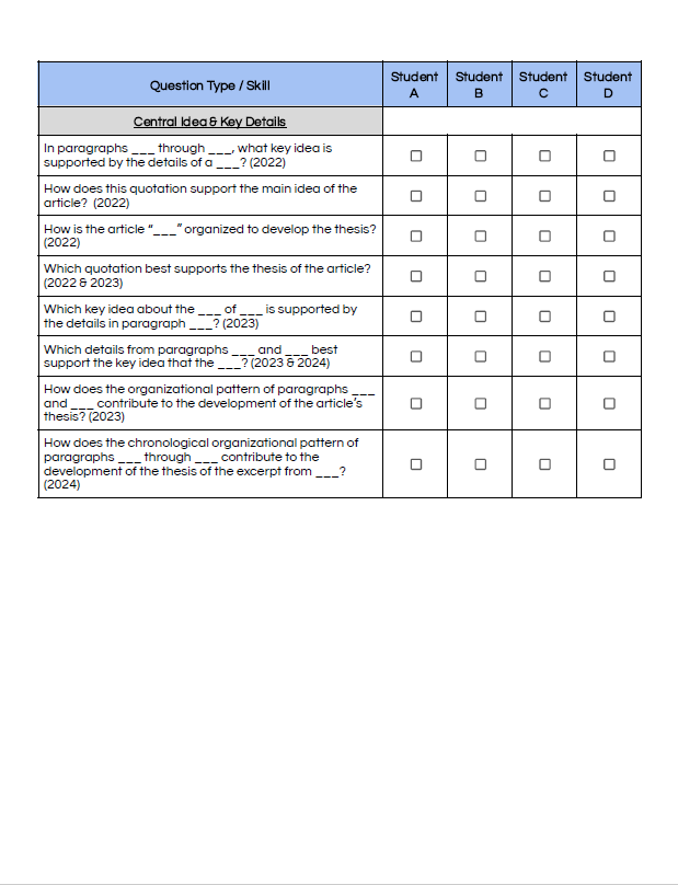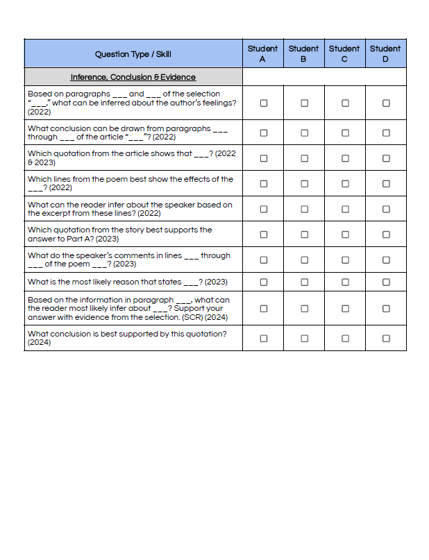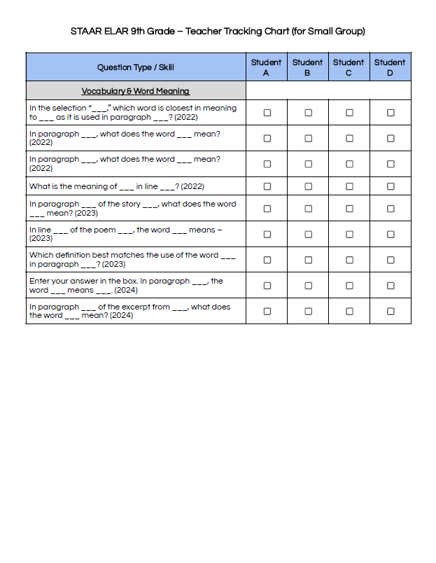 The Released Test Tracking Chart from the Teach BIG Assessment Alignment Series helps educators organize and target instruction using STAAR Reading Language Arts questions from 2022–2024. With categorized checklists and STAAR-specific vocabulary, it supports focused review, small group tracking, and precise planning for grades through 10.