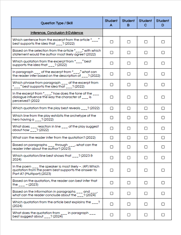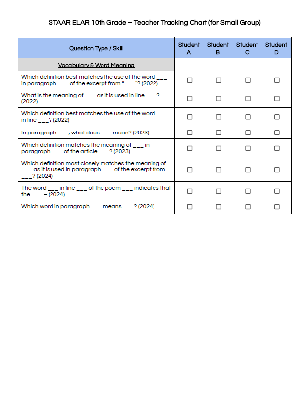 The Released Test Tracking Chart from the Teach BIG Assessment Alignment Series helps educators organize and target instruction using STAAR Reading Language Arts questions from 2022–2024. With categorized checklists and STAAR-specific vocabulary, it supports focused review, small group tracking, and precise planning for grades through 10.