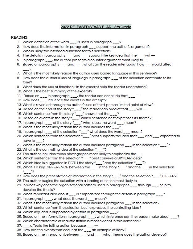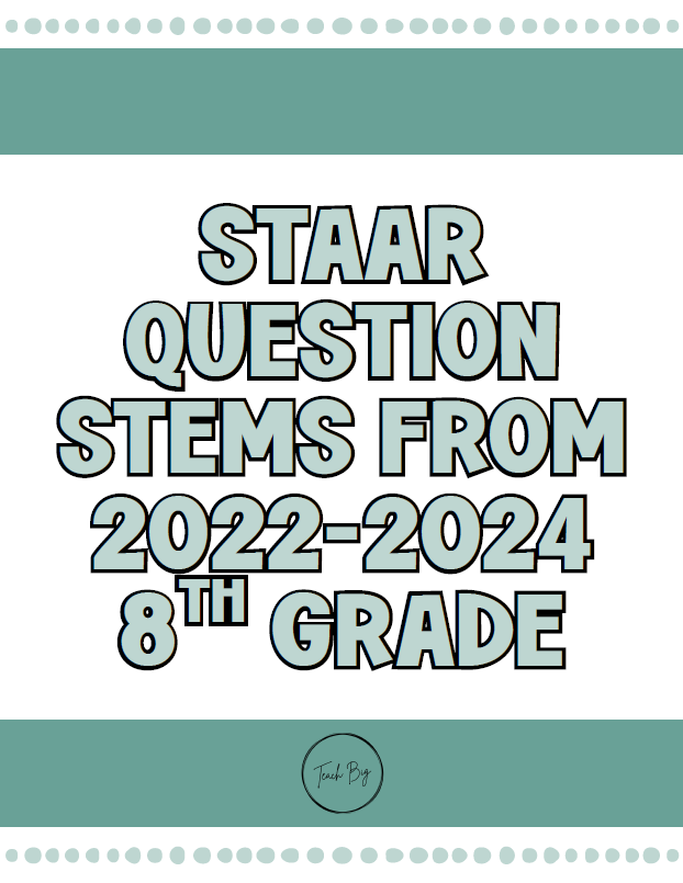 This $3 resource compiles every 8th grade reading, editing, and revising question stem from the 2022–2024 STAAR released tests. Perfect for bell ringers, exit tickets, small groups, and STAAR-style practice, it helps teachers align instruction and build student confidence using real test language. For deeper insight, pair it with Teach BIG’s STAAR Test Analysis, Academic STAAR Vocabulary packet, or their Online Assessment Platform featuring monthly practice passages, auto-grading, and built-in intervention tools. Learn more at teachbig.com.