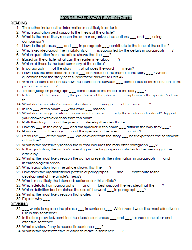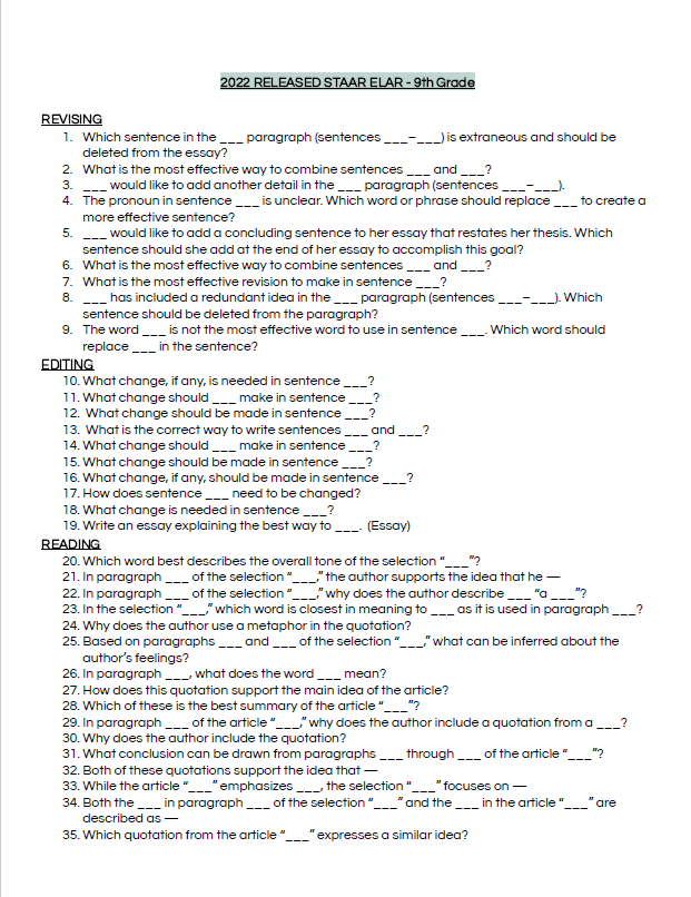 This $3 resource compiles every 9th grade reading, editing, and revising question stem from the 2022–2024 STAAR released tests. Perfect for bell ringers, exit tickets, small groups, and STAAR-style practice, it helps teachers align instruction and build student confidence using real test language. For deeper insight, pair it with Teach BIG’s STAAR Test Analysis, Academic STAAR Vocabulary packet, or their Online Assessment Platform featuring monthly practice passages, auto-grading, and built-in intervention tools. Learn more at teachbig.com.