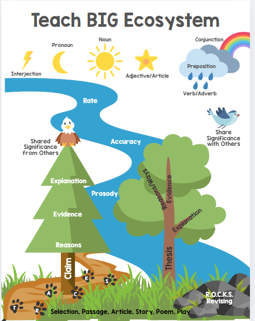 Show your students the big picture of writing success! The Teach BIG ECR Ecosystem is a full-color poster that visually demonstrates how every piece of the Full Circle of Language Arts (phonics, grammar, vocabulary, fluency, comprehension, and writing) works together to build toward a high-scoring Extended Constructed Response (ECR).