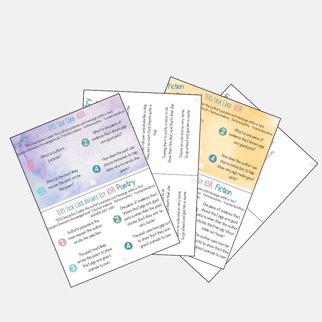 The TEKS Task Cards have short passages or excerpts included which are accompanied by four questions. The task cards are designed for small group, station work, or verbal practice during little nuggets of extra or transition time within the classroom.