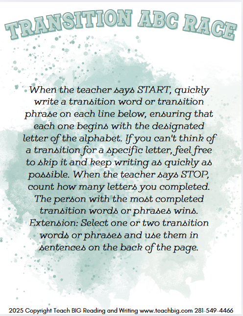 This section offers small group tutorials in reading, writing, vocabulary, and more to help meet House Bill 1416 standards. Activities are printable in color or black and white, with instructions included. For 3–6 free monthly activities and access to lessons, assessments, and CPE credit videos, join the Teach BIG online subscription platform for grades 4–6.
