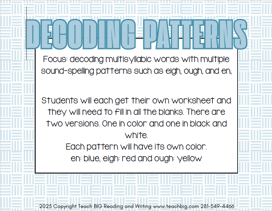 This section provides targeted small group tutorials in reading, writing, and language skills to support House Bill 1416 standards. Activities are printable and self-guided. Teach BIG also offers a subscription with free monthly resources, digital lessons, STAAR 2.0 practice tests, and video lessons for CPE credit.