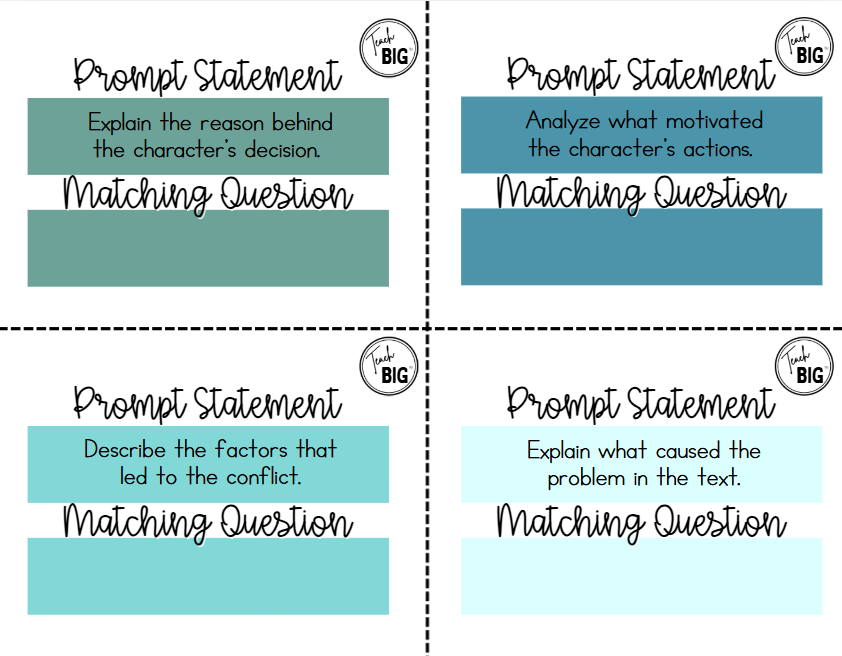 In this matching activity, students pair academic prompt statements with their corresponding “Why” questions to identify the reasoning task each prompt requires. Students focus on recognizing cause, motivation, purpose, and reasoning rather than answering the question itself. This game strengthens students’ ability to interpret prompts accurately, builds clarity around WHY-based thinking, and prepares students to respond with focused, evidence-based explanations in future writing tasks.